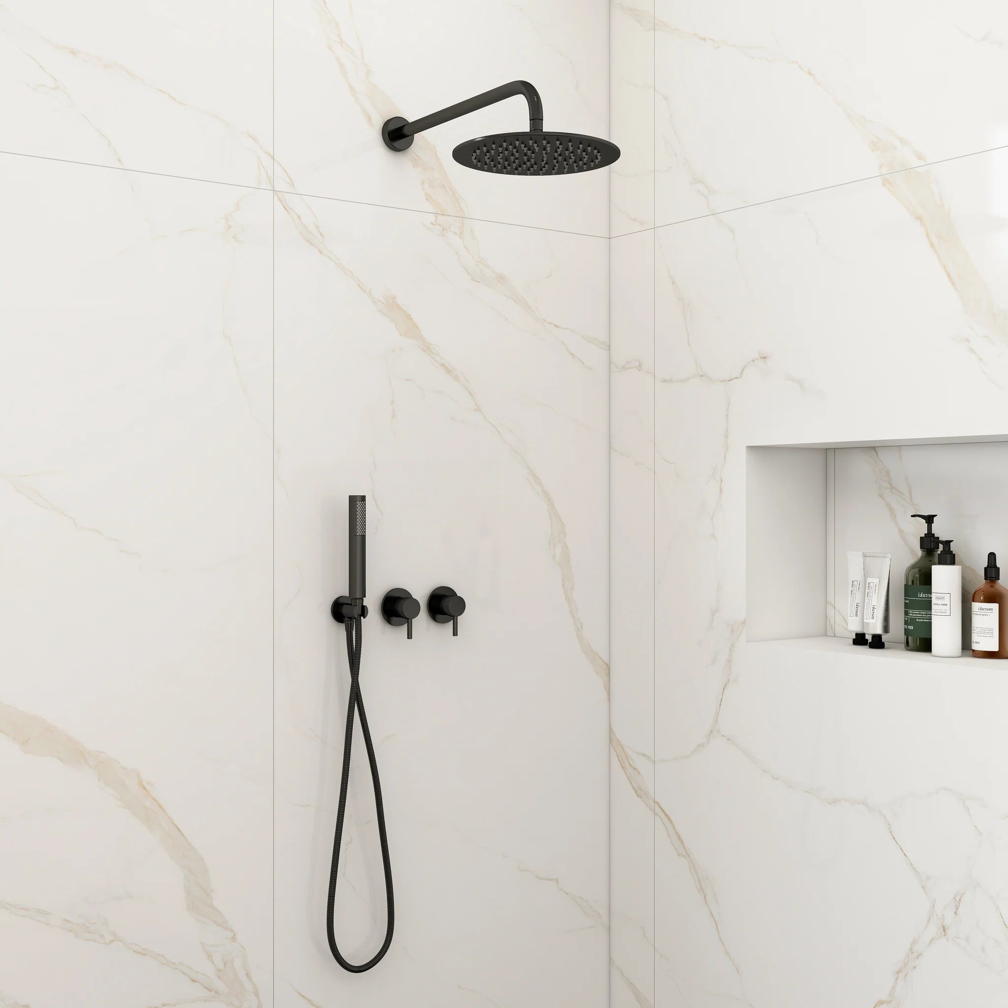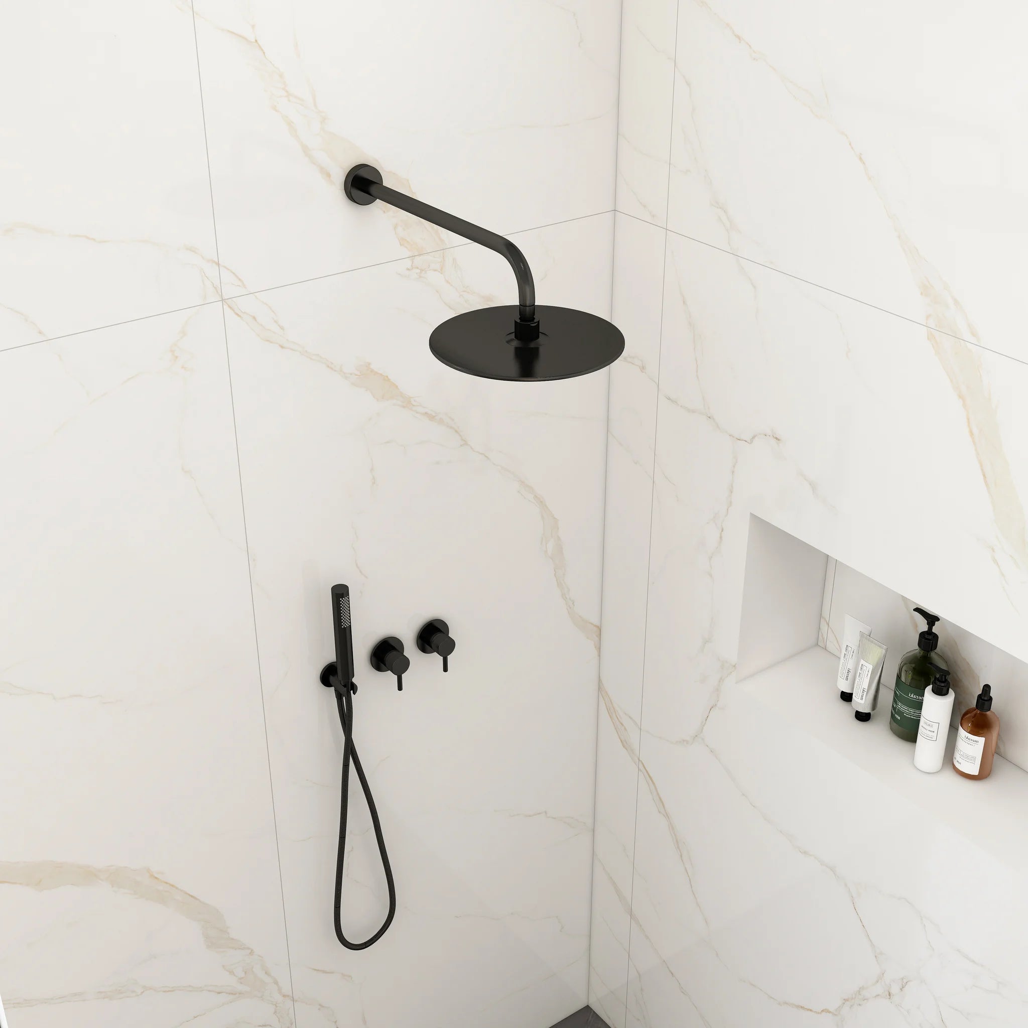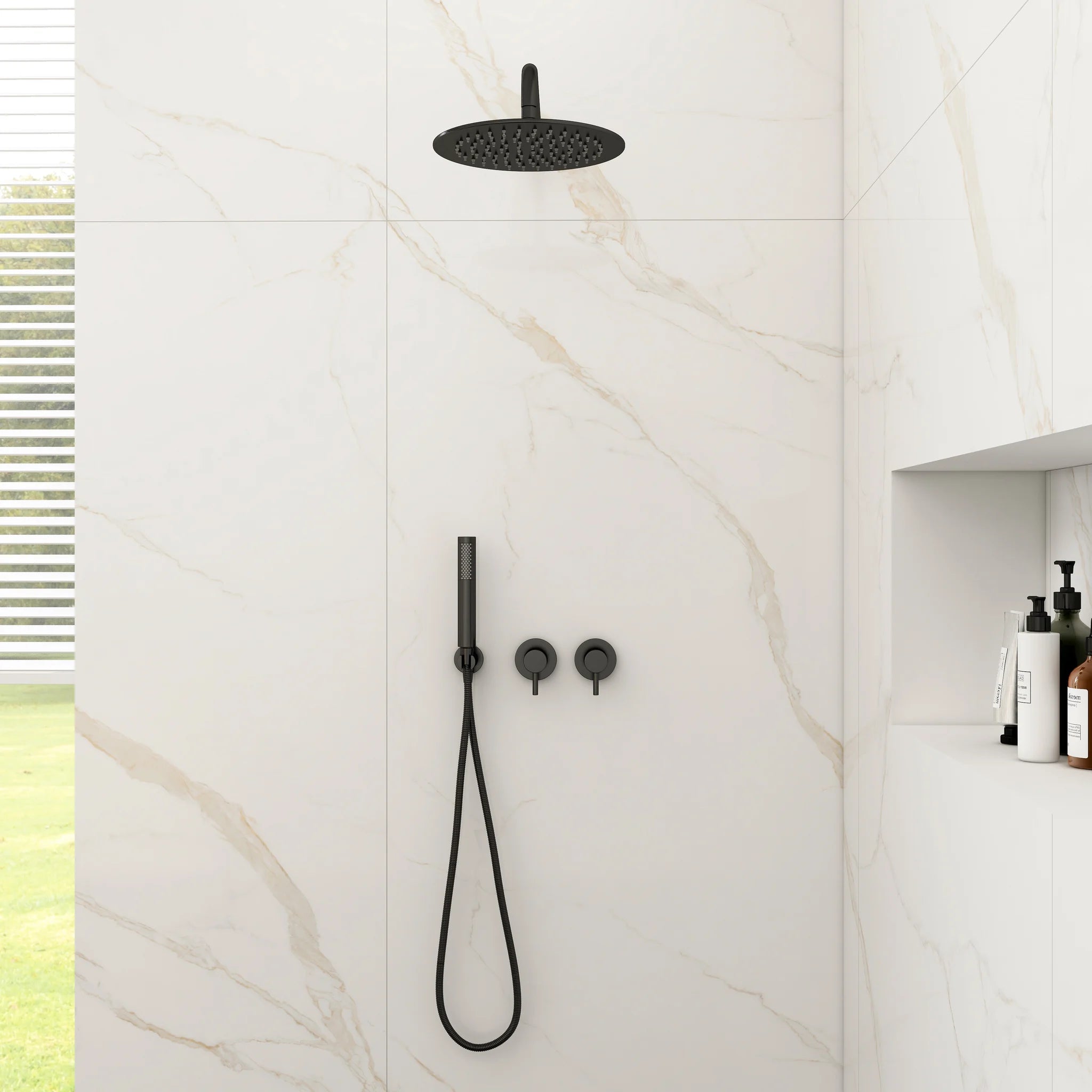 Sleek and functional, this wall-mounted 250mm black round shower set offers two showering functions, including a handheld shower, for versatile use. Its minimalist design fits seamlessly into modern spaces.