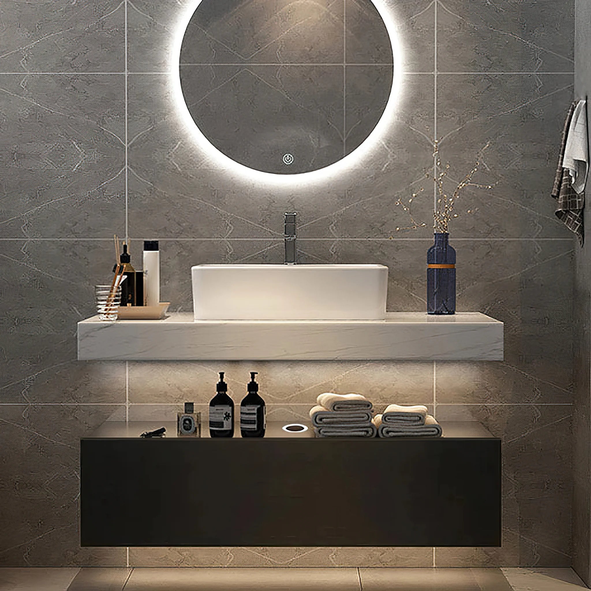 The Astra vanity blends natural oak tones with a stone countertop and smart LED mirror,