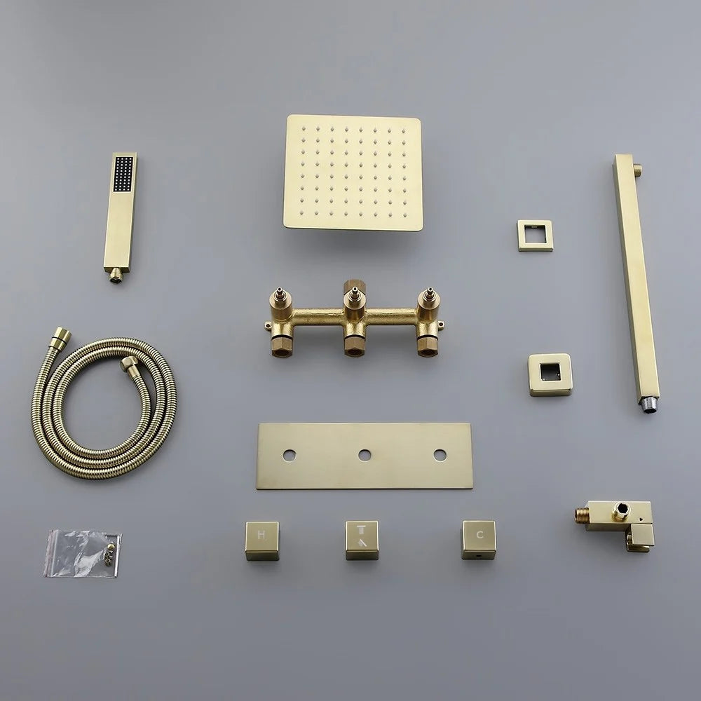 Add elegance to your bathroom with this square brushed gold rain shower set, featuring a
