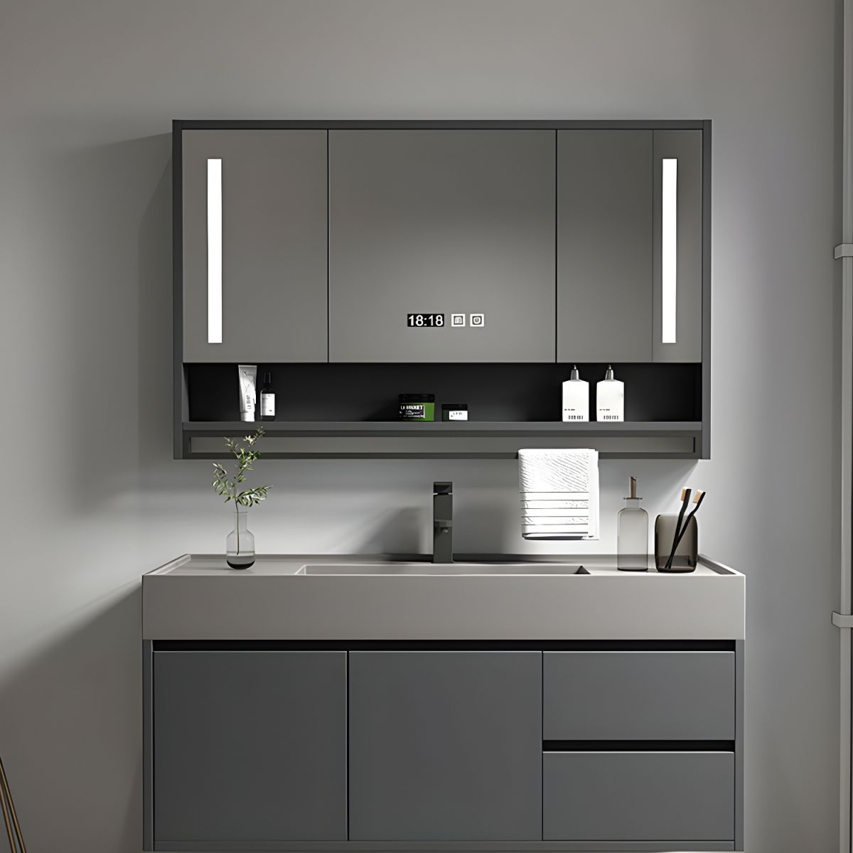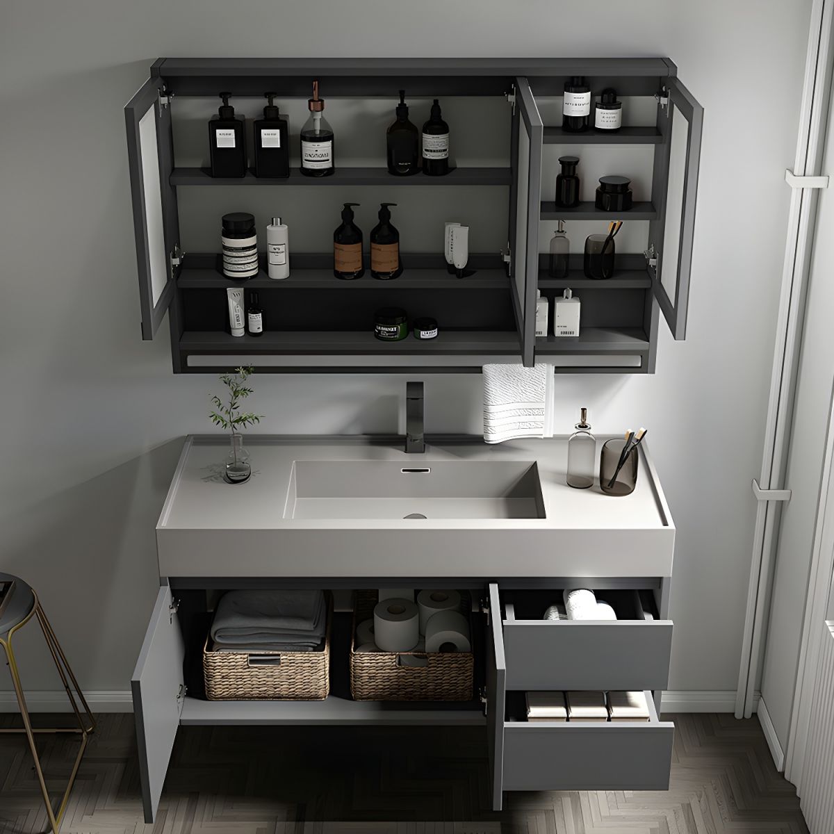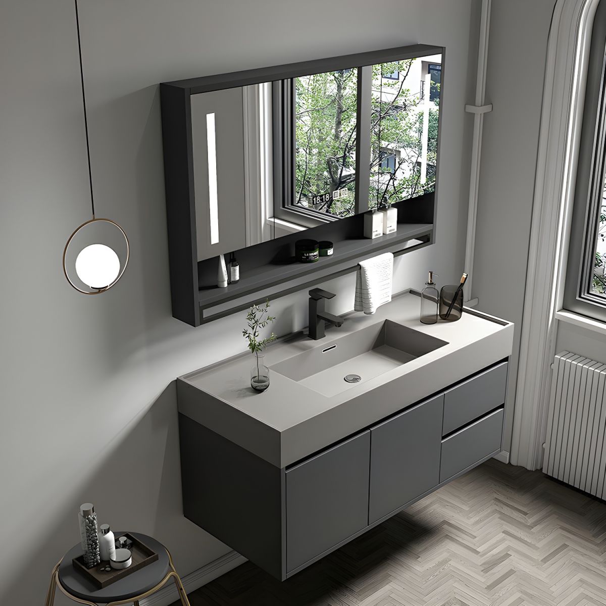 stone countertop, integrated sink, and matching mirror. Perfect for contemporary spaces, this